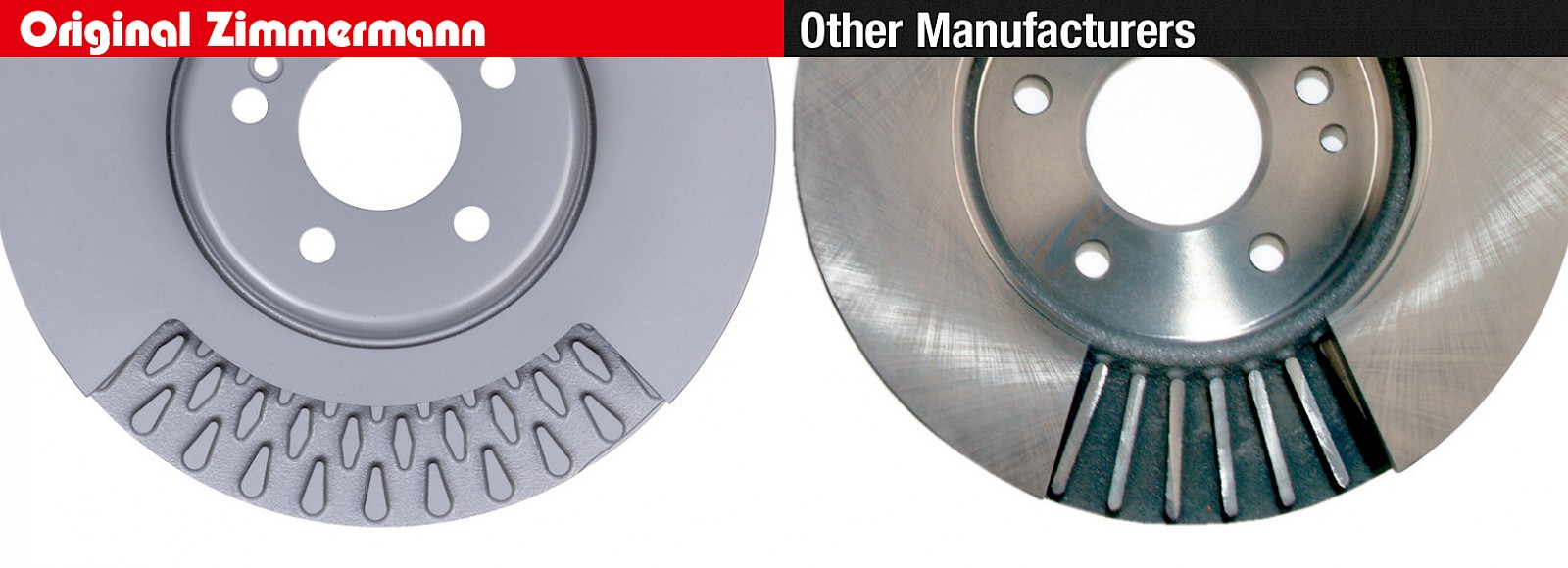 So if the original part has straight, angled or curved ribs, the Zimmermann brake disc is designed in exactly the same way. If the original disc was constructed with pillars in the ventilation duct, the same design is used here too. This ensures maximum quality and safety by following the specifications of the original parts.