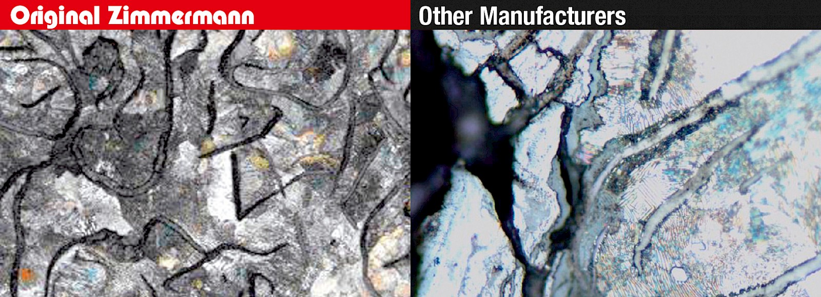 The gray cast iron used offers high compressive strength, excellent damping and low wear properties as well as good thermal conductivity. The high compressive strength of the material is due to the evenly distributed carbon lamellae in the gray cast iron (see illustration on the left), which form three-dimensional ramifications and thus ensure high stability. If oxygen is trapped during the casting process, oxidation occurs on the graphite lamellae (see illustration on the right) when the disc heats up while braking. As a result, the thermal conductivity of the cast material suffers, the brake disc is not heated evenly and therefore cannot cool down evenly. According to Zimmermann, it is therefore important to work exclusively with foundries that carry out the casting and cooling process perfectly and can meet the individual casting specifications of the respective brake disc.